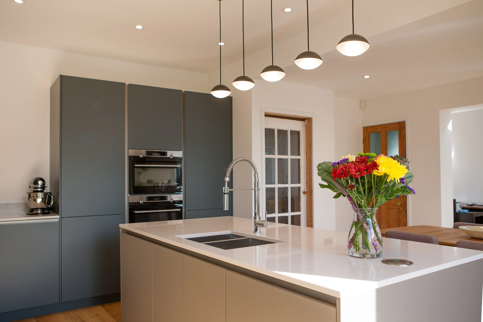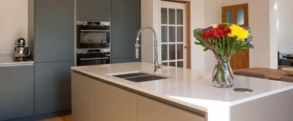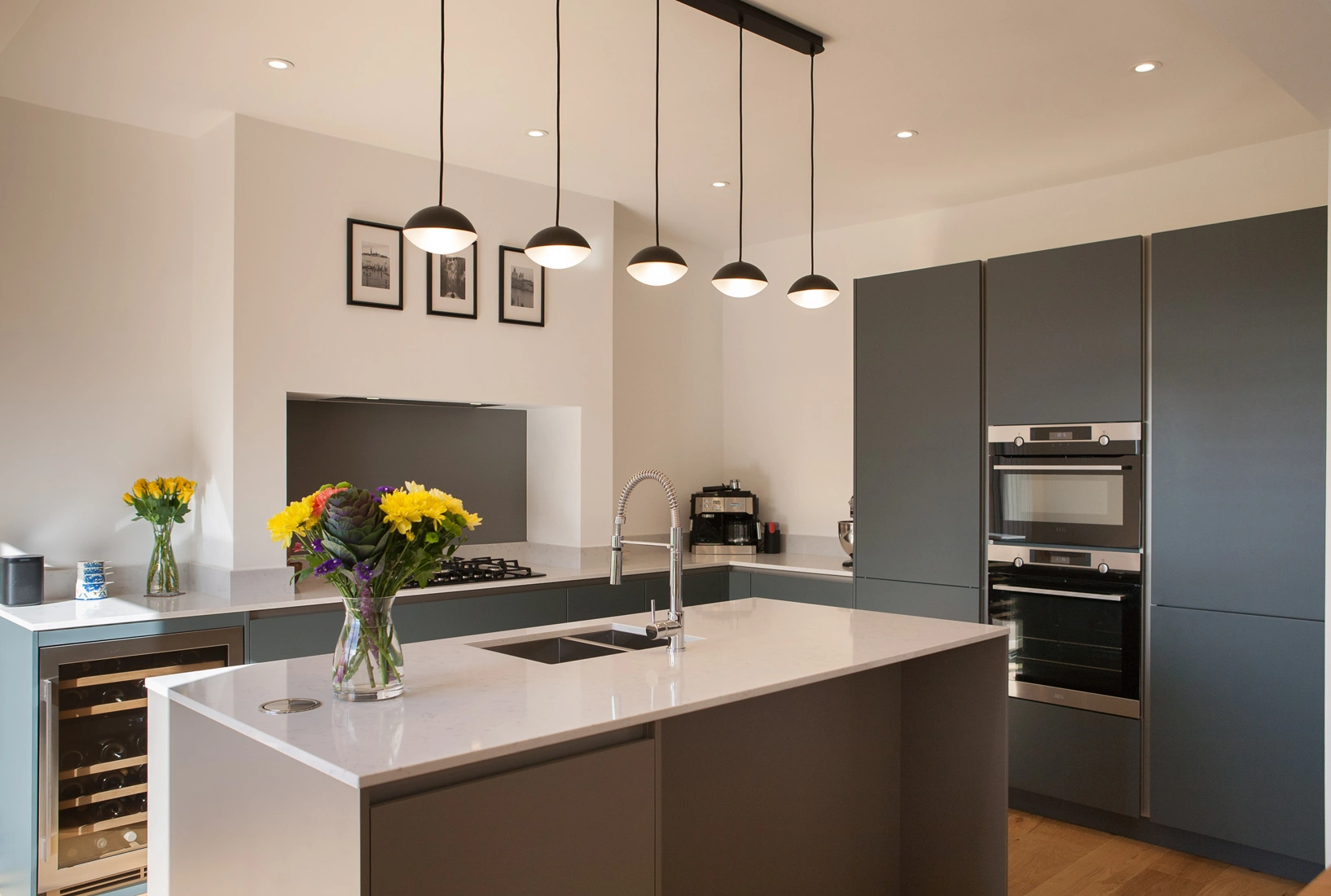 We love this luxurious kitchen, designed by Kreativ Kitchens who are based in Leeds. The high ceilings and white walls create an open, airy space which is complimented by a sleek, ultramodern kitchen. The design includes grey-green cabinets, all handle less to emphasise the modern design. They opted to paint the alcove above the hob with the same colour to tie the scheme together and resulting in a coherent space that remains bright. Using a dark green is a popular colour that is very on trend at the moment, and it is beautifully paired with the Lagoon worktop from Silestone. Lagoon is a popular white quartz, with an off-white base colouring. The stunning stone features a detailed pebble-like pattern of beige, grey, white, and taupe speckles. Faint grey veins can be seen against the white bedrock, creating beautiful dimension and movement throughout the stone. It is a simple, yet stunning choice for this kitchen, as it enhances the luxury that this space emulates.Â
