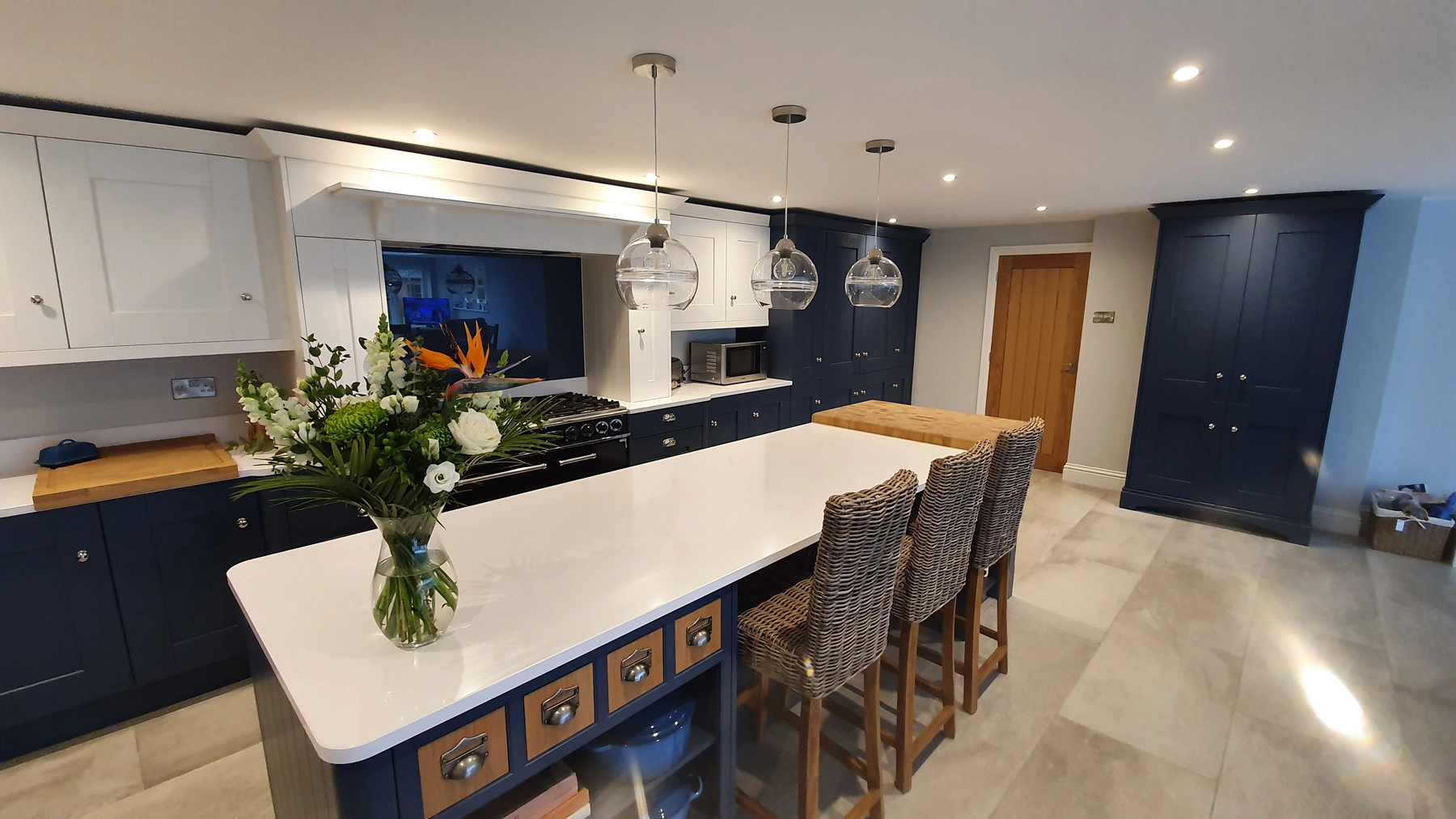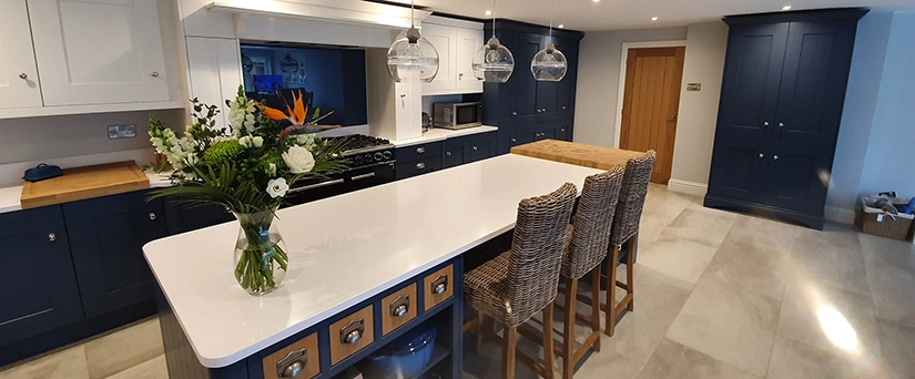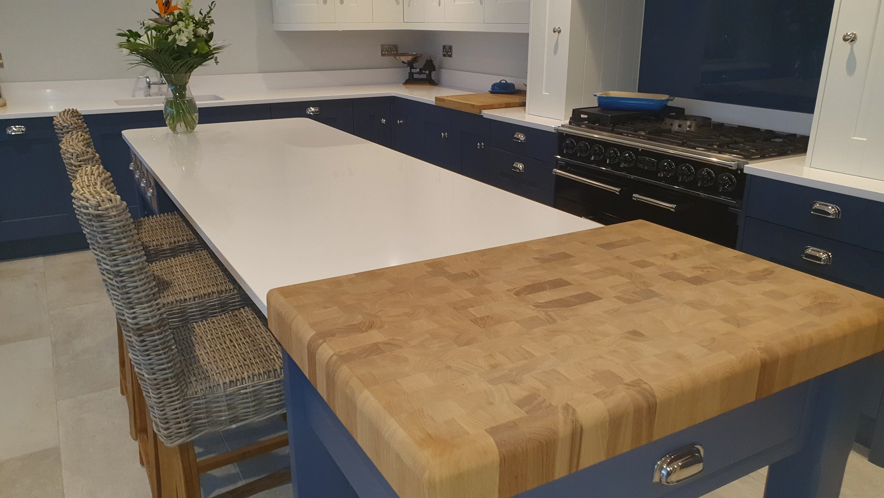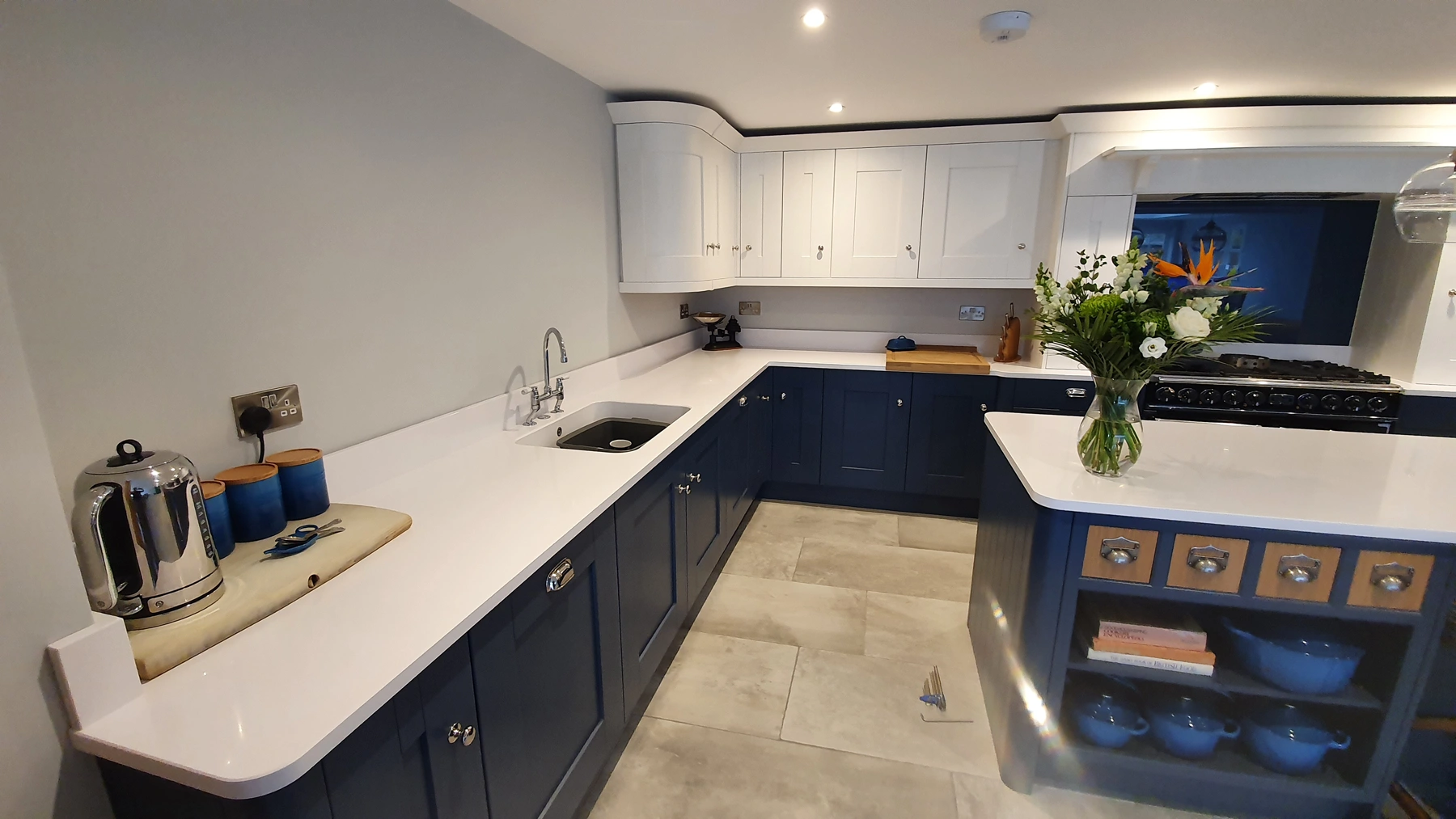 The worktops feature matching upstands and rounded corners to create a soft yet coherent design that flows throughout the space. Overall the design is classic, with the worktops providing a modern luxurious element. The blue cabinets are bold and eye-catching, but also very in fashion with current interior design trends. By choosing white for their wall hung cabinets, the customers have aided in keeping the space bright and open. To incorporate the farm style even further, they opted for a wooden section on their island, adding a functional preparation space, but also a nod to the traditional design style they were inspired by. Incorporating a range cooker also achieved this. The blend of colours and textures results in a classic space that the customers can enjoy for years to come.Â
