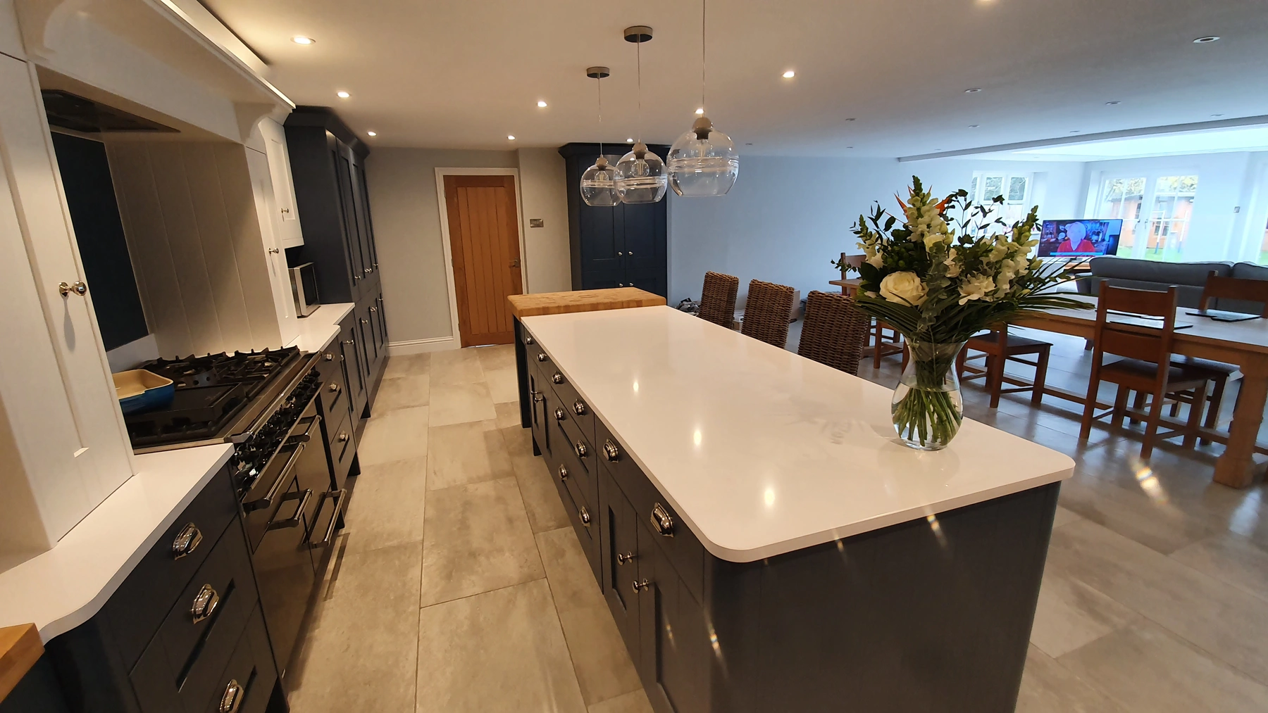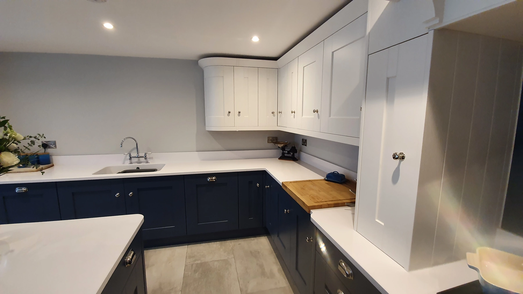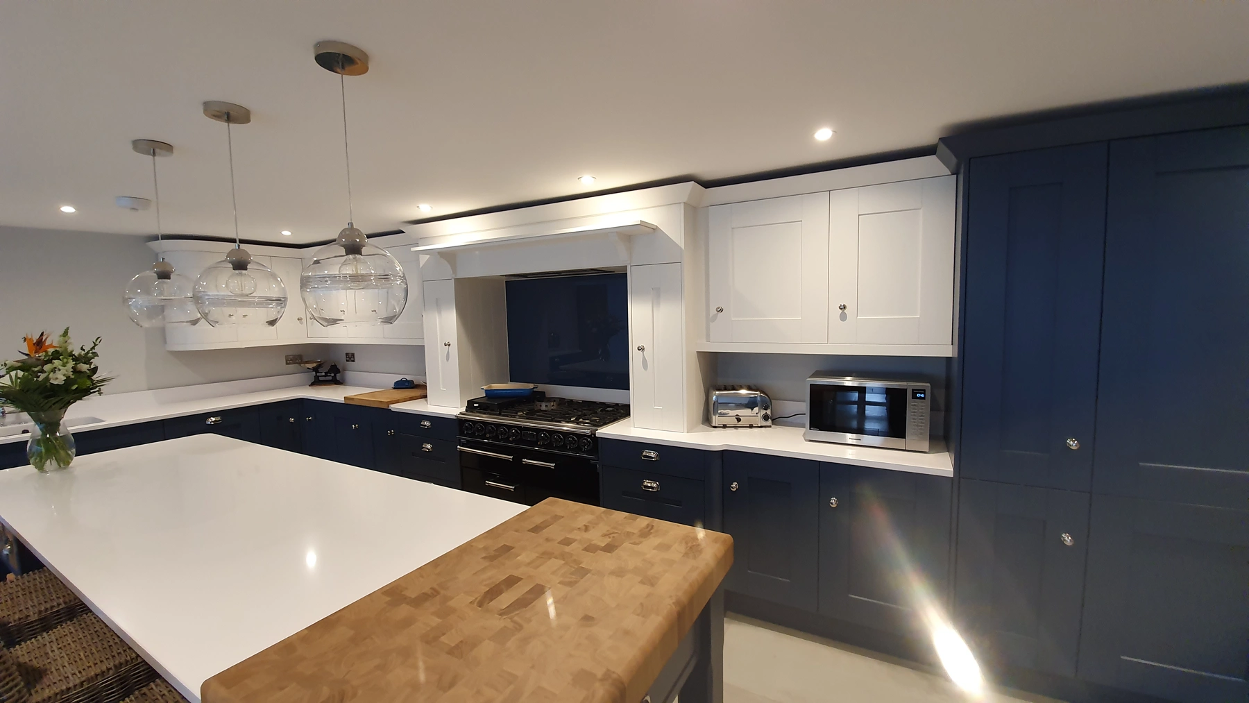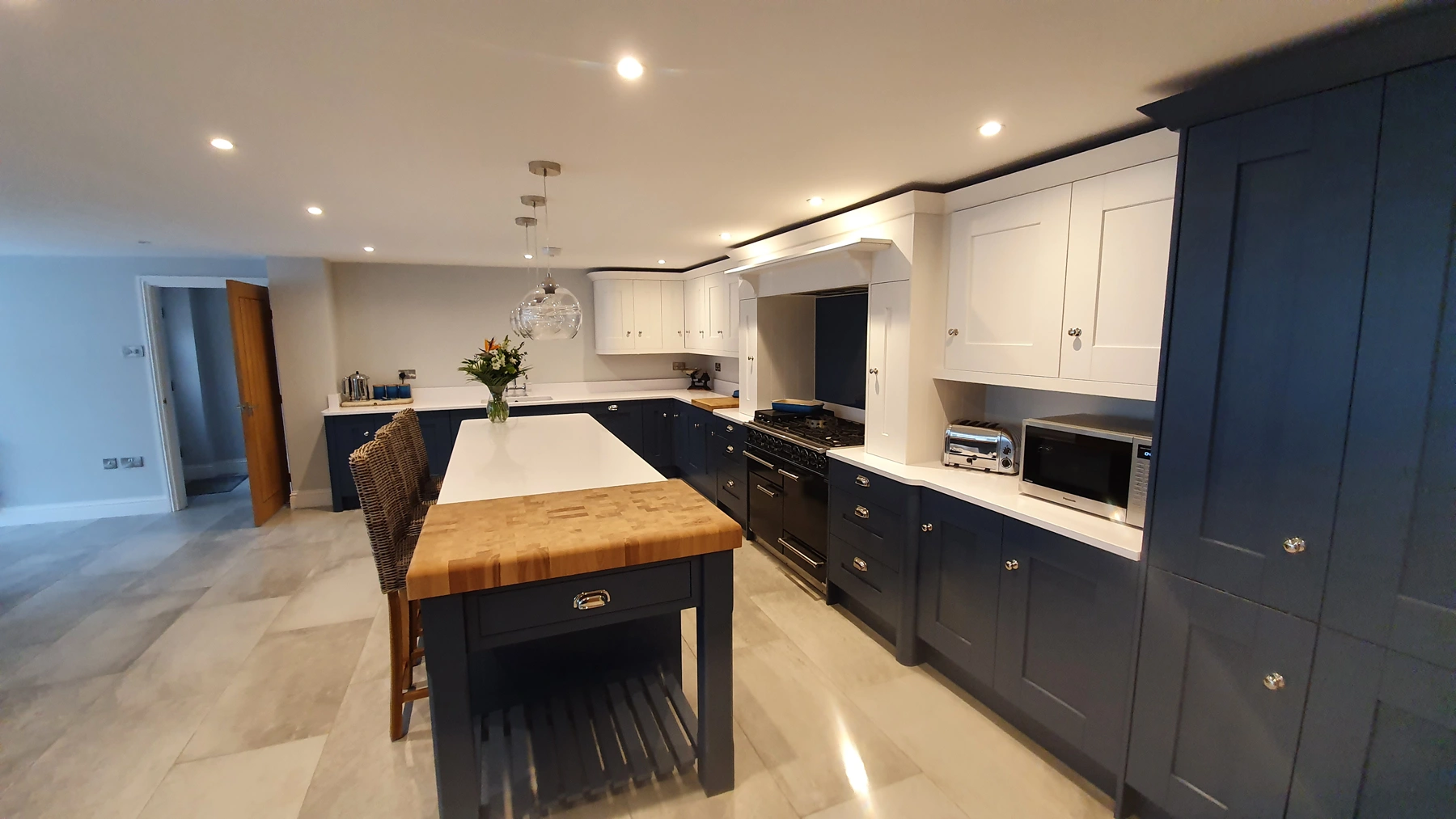The worktops feature matching upstands and rounded corners to create a soft yet coherent design that flows throughout the space. Overall the design is classic, with the worktops providing a modern luxurious element. The blue cabinets are bold and eye-catching, but also very in fashion with current interior design trends. By choosing white for their wall hung cabinets, the customers have aided in keeping the space bright and open. To incorporate the farm style even further, they opted for a wooden section on their island, adding a functional preparation space, but also a nod to the traditional design style they were inspired by. Incorporating a range cooker also achieved this. The blend of colours and textures results in a classic space that the customers can enjoy for years to come.Â