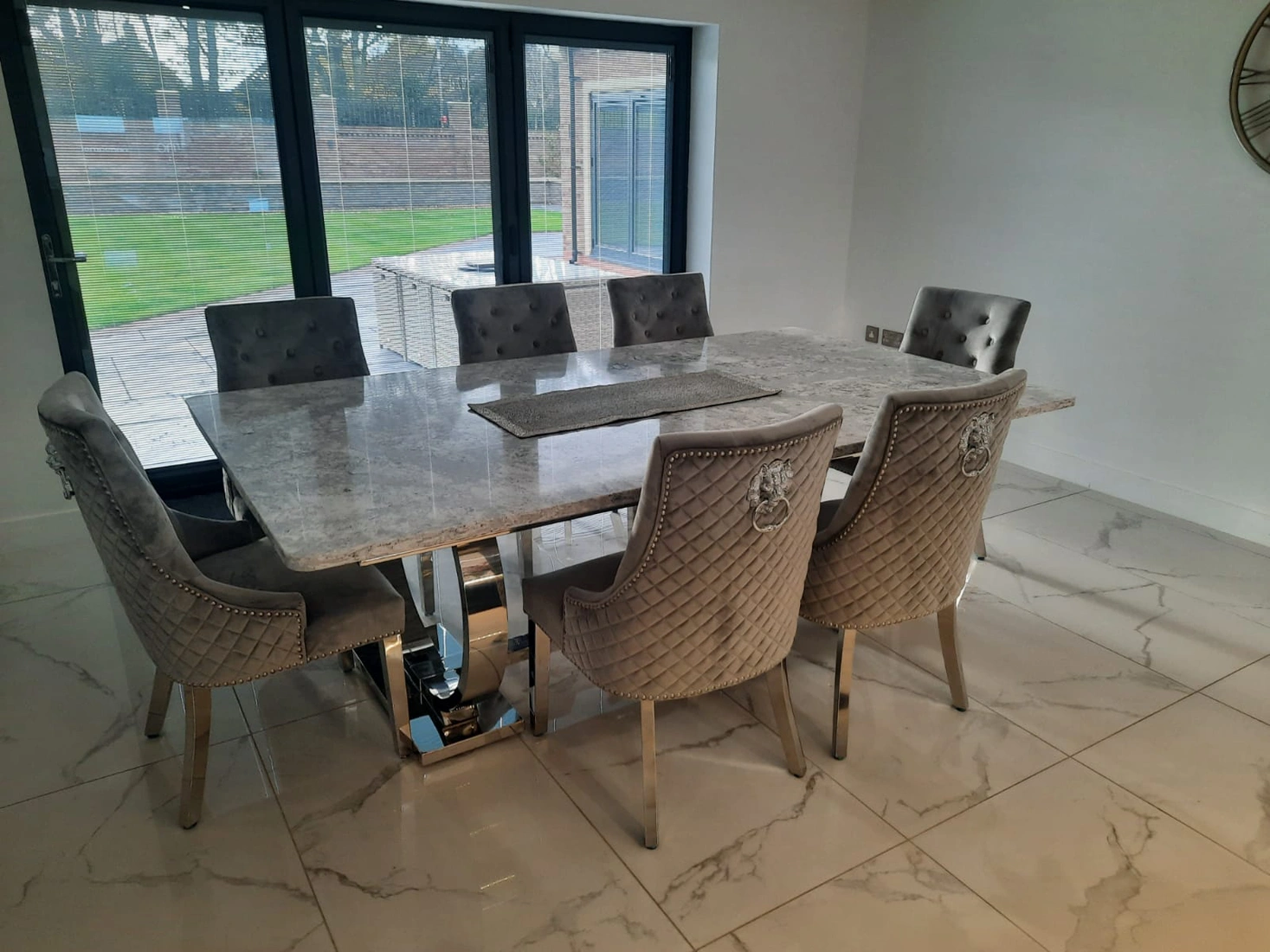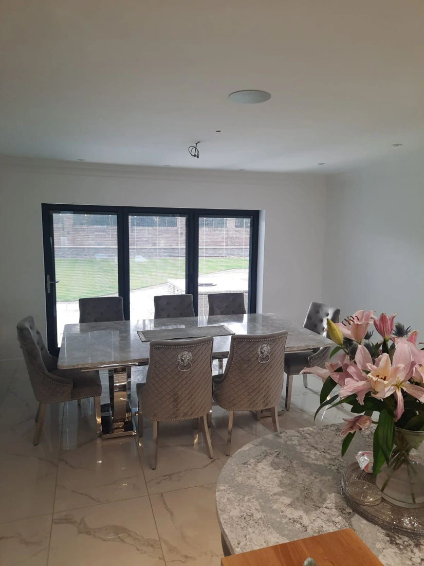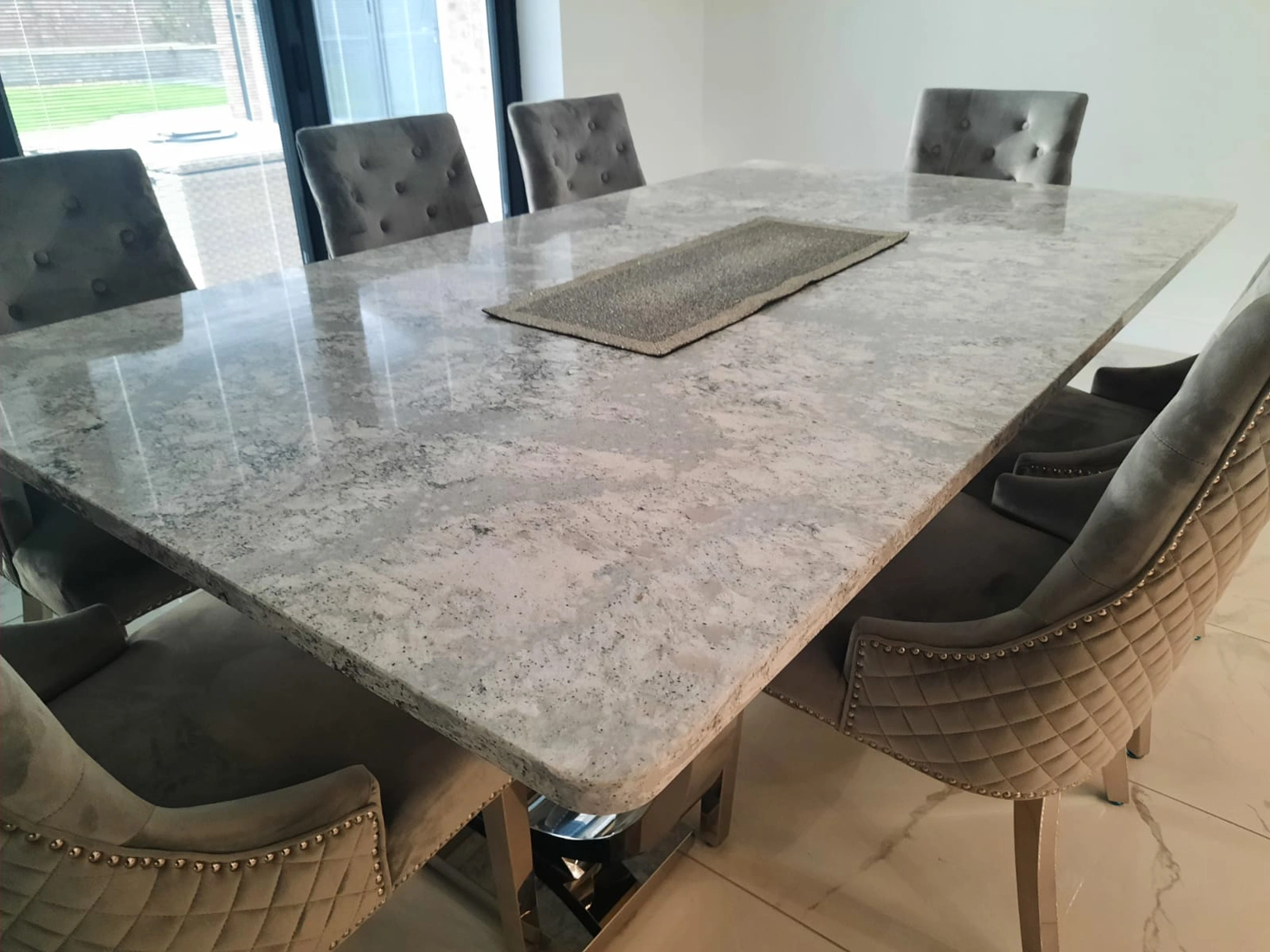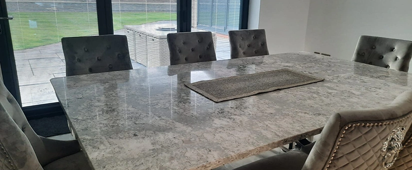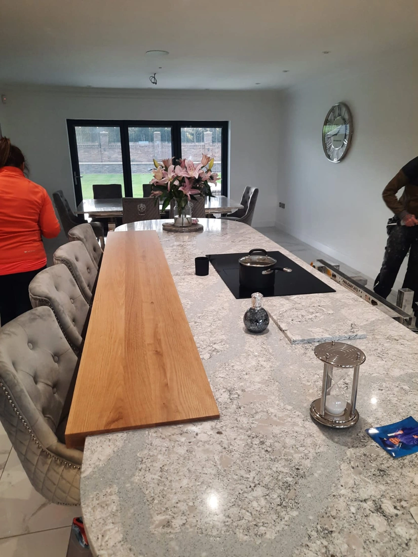 This beautiful kitchen was designed by Rose & Co Homes who are based in Worksop. They made the customers’ design ideas come alive, and together with us, we created their worktops and matching table top. Both have been made using Cambria quartz in shade Summerhill, which as you can see is a meld of white and greys with darker flecks, all clouded together and resulting in a stunning surface. The overall theming of this kitchen design is neutral with light tones of grey and white amongst more of the soft and hard furningishing in the whole room, so Summerhill was a fabulous choice. Having the table and worktops made using the same material creates a coherent design, and ties multiple elements of a larger space together.Â