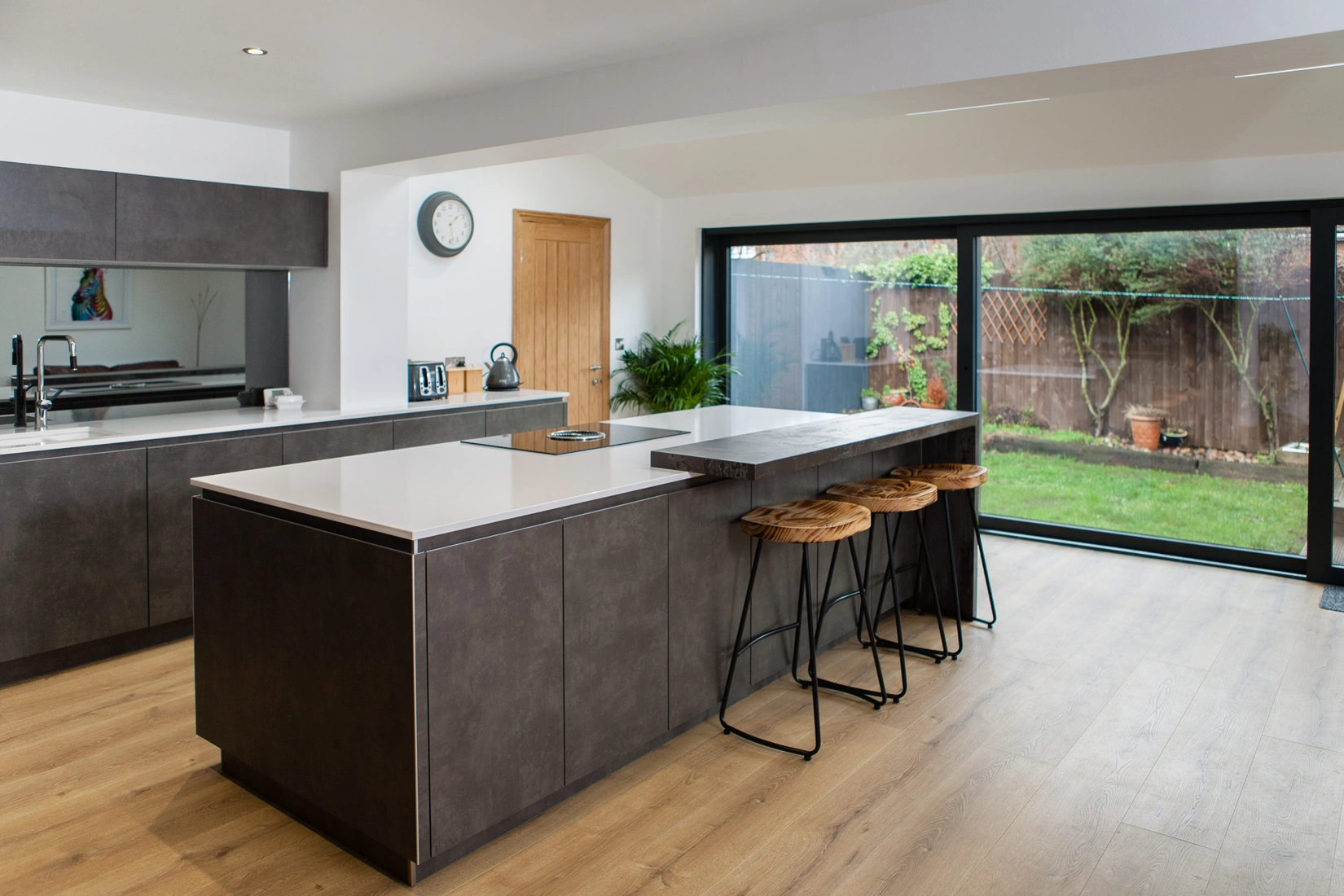 Here we have a kitchen designed by the team at Kreativ Kitchens, based in Leeds. They brought these customers’ design ideas to life, creating a contemporary space with elements inspired by industrial style. To achieve this, the designers opted for handle less cabinets to create clean lines throughout the space, as well as choosing doors with a cement style design. This compliments the Dekton Trilium breakfast bar, manufactured by us, beautifully and once again emulating the industrial design that stands out from this kitchen. Trilium offers a mixture of colours inspired by volcanic stones and intense grey and black touches. This also provides a brilliant contrast to their worktops, where they chose Silestone White Storm, a crisp, white quartz.