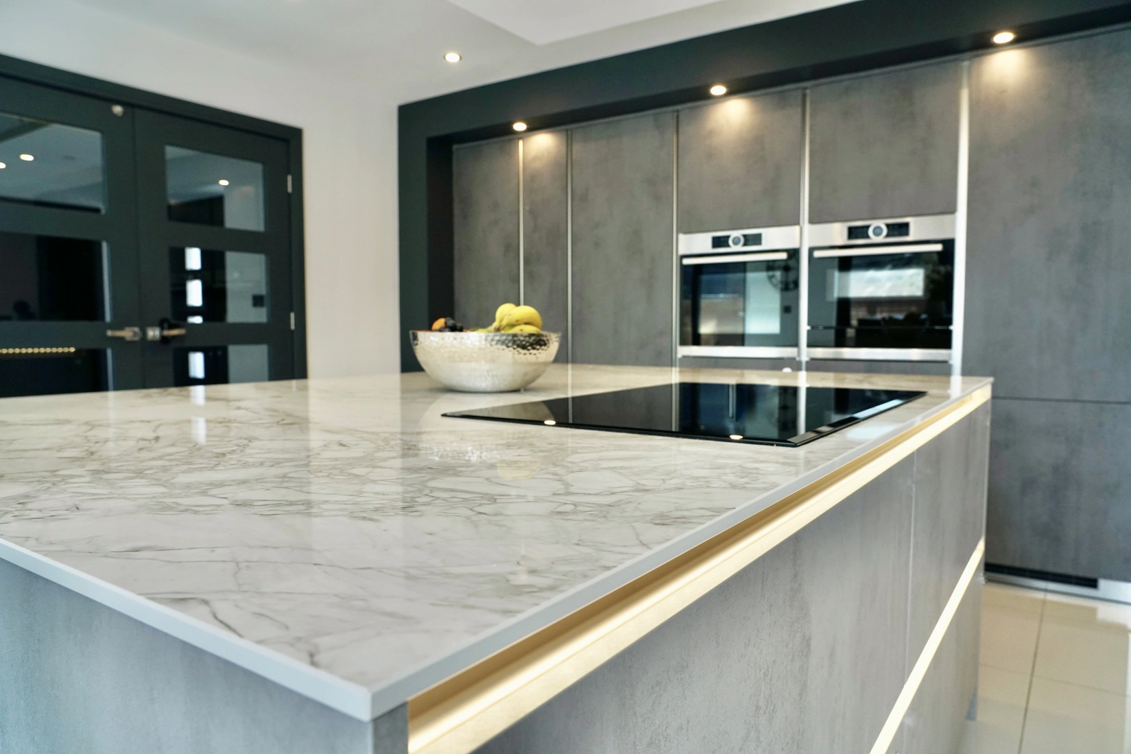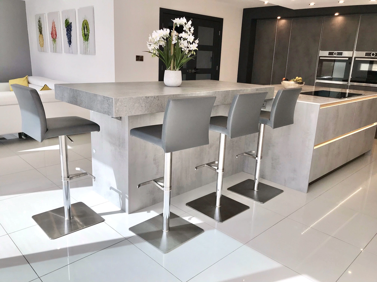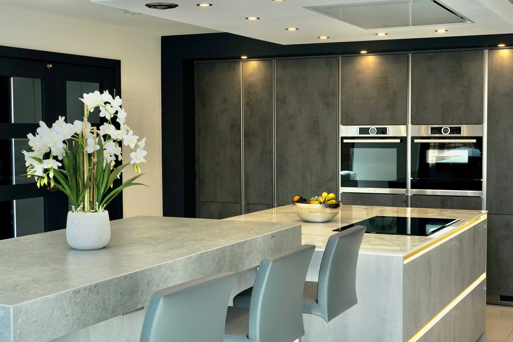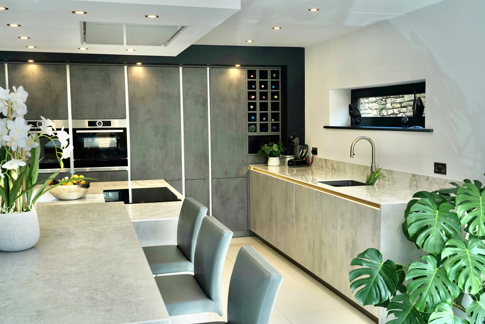 It also features a Dekton Kreta breakfast island area. Kreta offers the look of concrete. In contrast, concrete is used in construction and building but is not practical for areas in contact with water. It can be applied to kitchen worktops, splashbacks and bathrooms without worries. In addition to great aesthetics, Kreta is resistant to stains and scratches. Dekton is made by mixing a highly developed mix of porcelain, quartz, glass and raw materials. It results in an ultracompact surface that is highly resistant to heat, freeze, scratches, staining. In addition, it is suitable for both indoors and outdoors applications. In addition, Dekton resists UV rays, ensuring the material won’t degrade nor fade with the passage of time. Similarly, it has low thermal expansion, ensuring there won’t be thermal shocks when exposed to either high heat and/or freezing. And also, its high abrasion resistance offers a surface that is easy to work on, ensuring they never require sealing.
