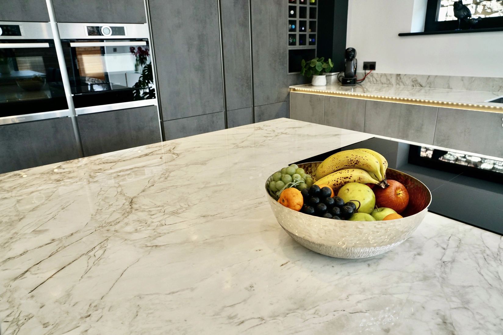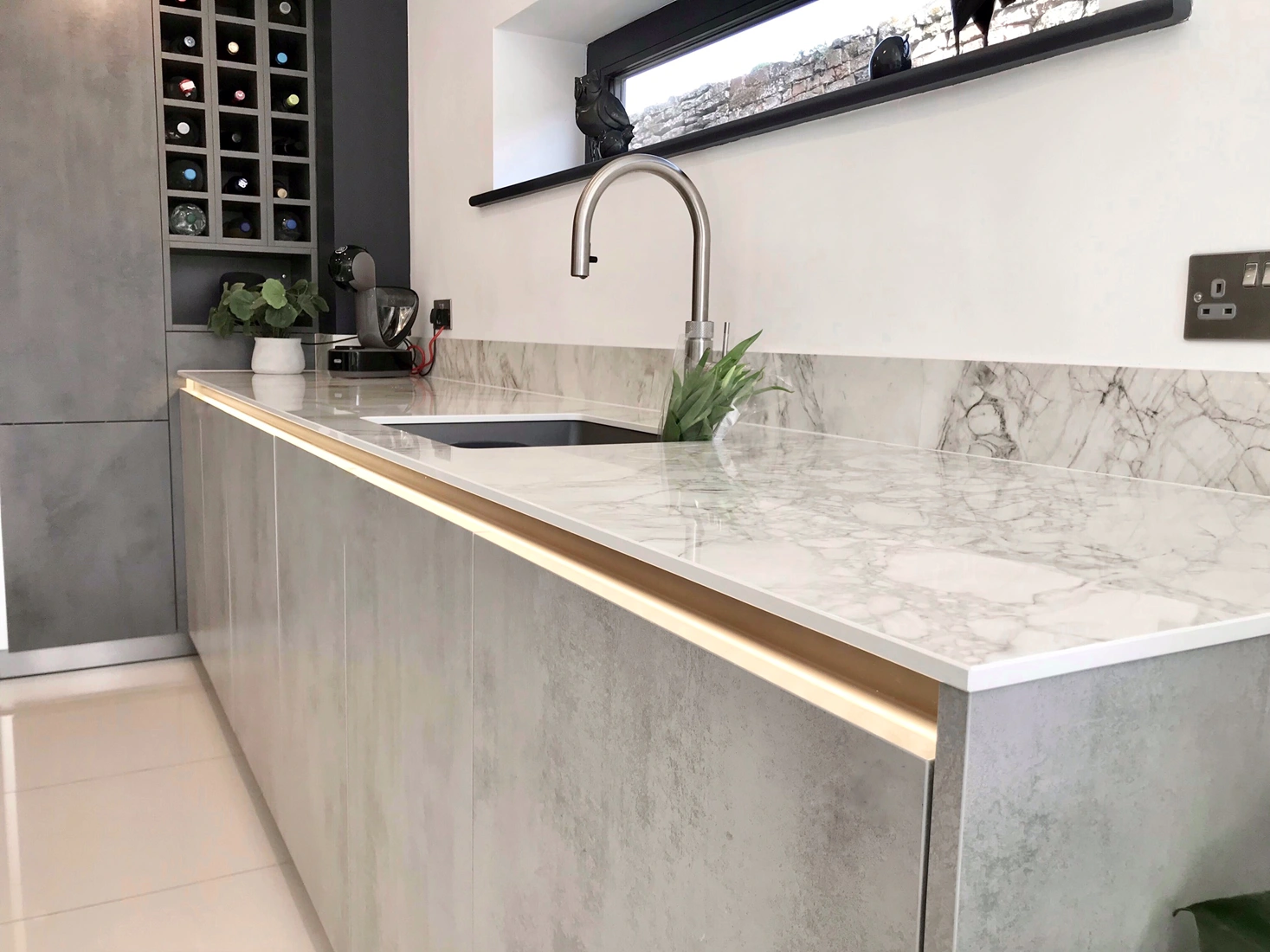 This kitchen designed by Kitchen Studio, Doncaster, brilliantly mixes classic and contemporary design. It features two colours of Dekton, an ultracompact stone used here for worktops. The primary option is Dekton Bergen, inspired by natural Portobello stone, Bergen strives for perfection in tone, structure and depth. The beauty of its greyish veins with sculptural pattern, on an off-white base are loaded with personality and elegance. It provides a contrast to the grey cabinets. They have a concrete style design, as well as being handleless to offer a sleek, industrial feel. Bergen adds a luxurious element to the space, breaking up the industrial interior.Â