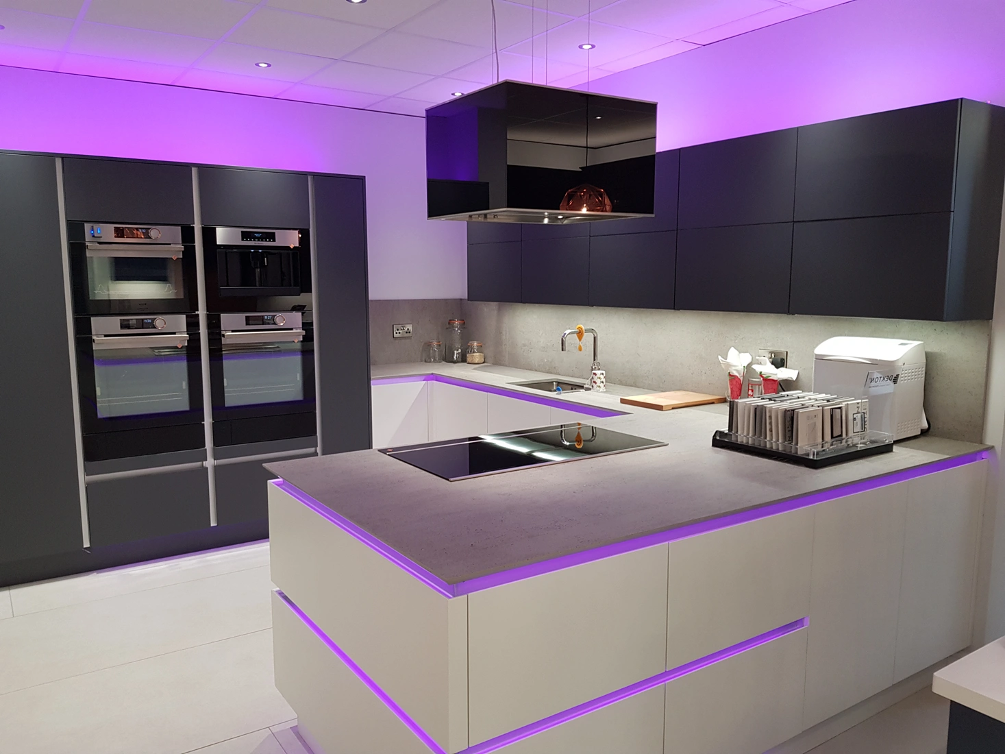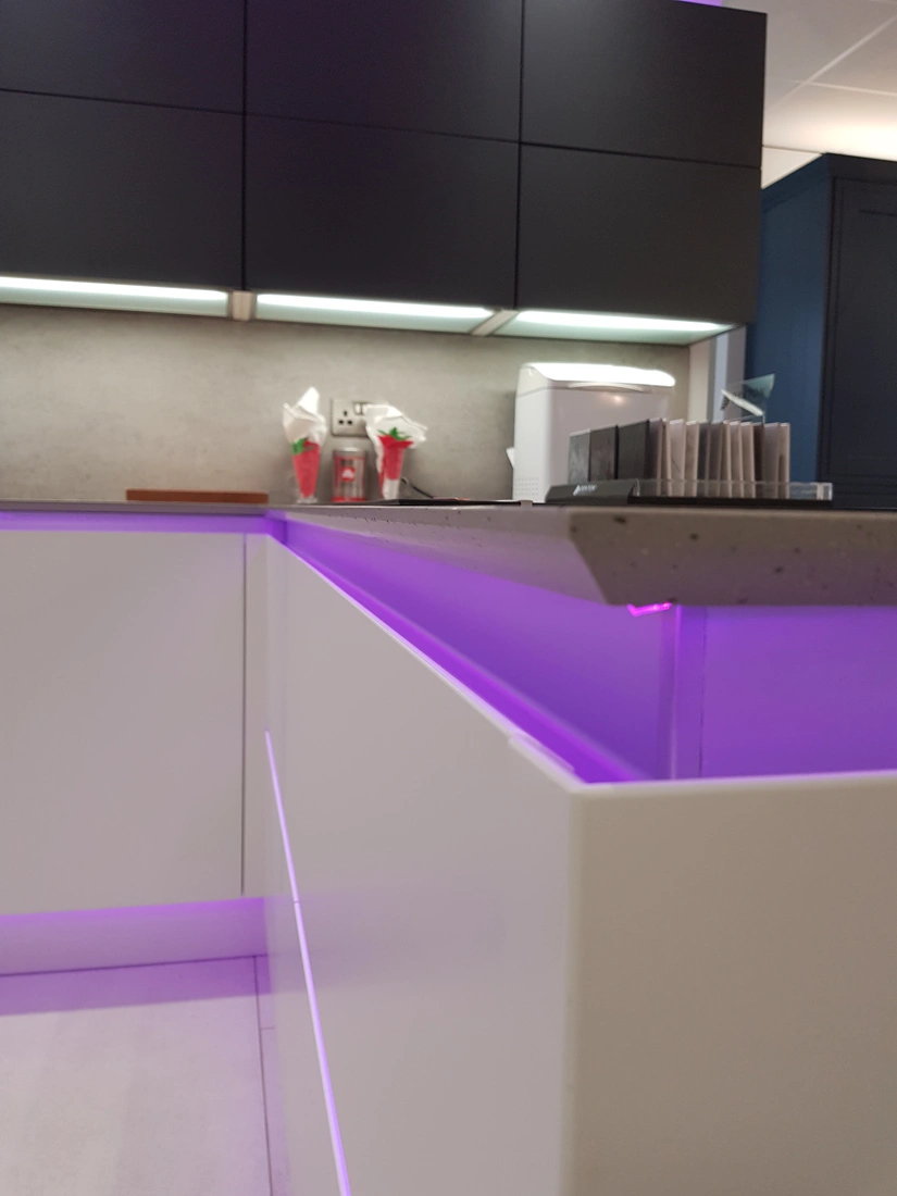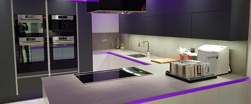Here we have a beautiful, contemporary kitchen designed by Ultimate Kitchens who are based in Rotherham. We manufactured this worktop for one of their showroom displays using Dekton, an ultra-compact surface from Cosentino. They opted for the shade Keon, a colour that takes its inspiration from concrete, resulting in an industrial style material. It suits this kitchen design beautifully, with its clean lines and monotone colour palette. The designers opted for neutral tones, such as dark grey and white for their cabinets, keeping it simple and allowing the worktop to compliment the design. There is a backsplash panel behind the sink that continues the whole length of that wall, really showing off the worktop, and showcasing a possible design element to their customers. They also opted for a Shark nose profile edge, which is exciting, yet simple. We also love the addition of neon light strips in this modern space.
