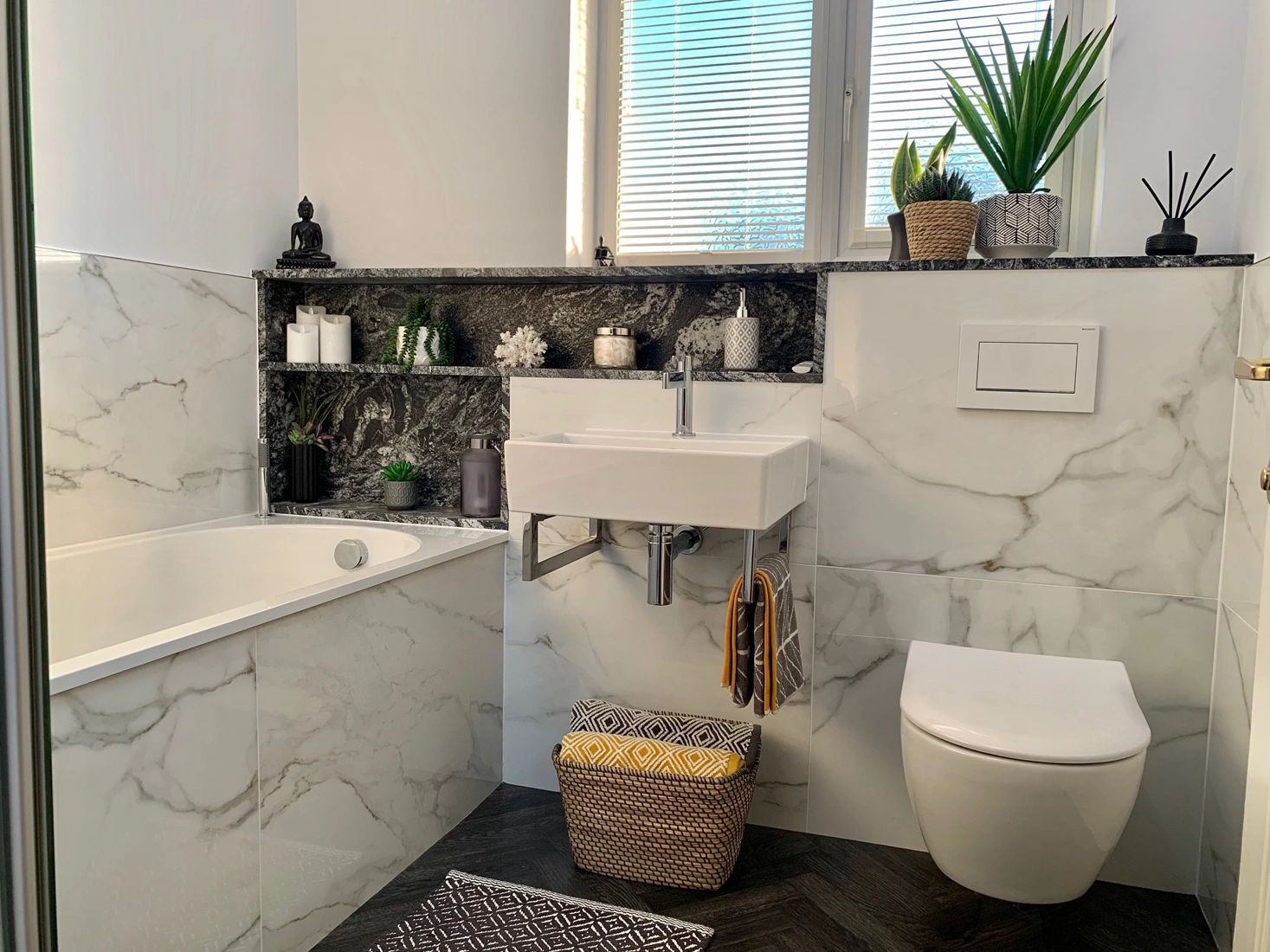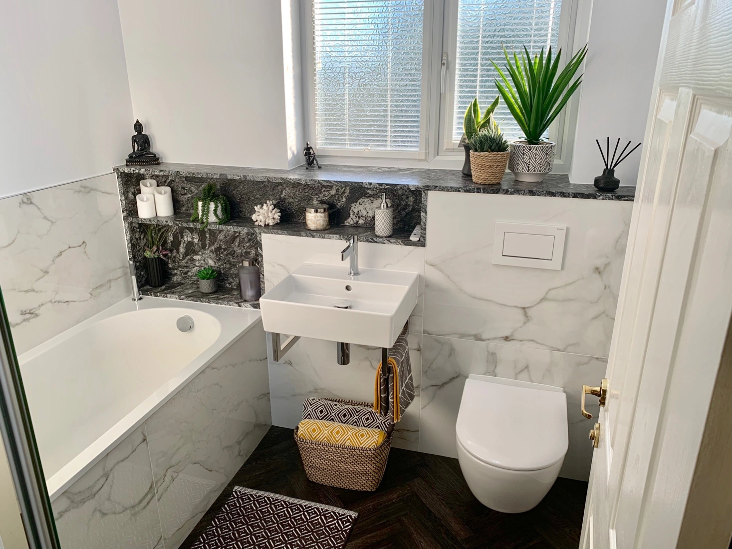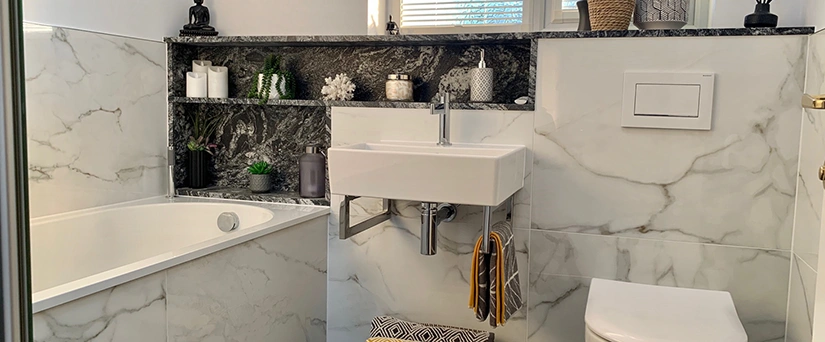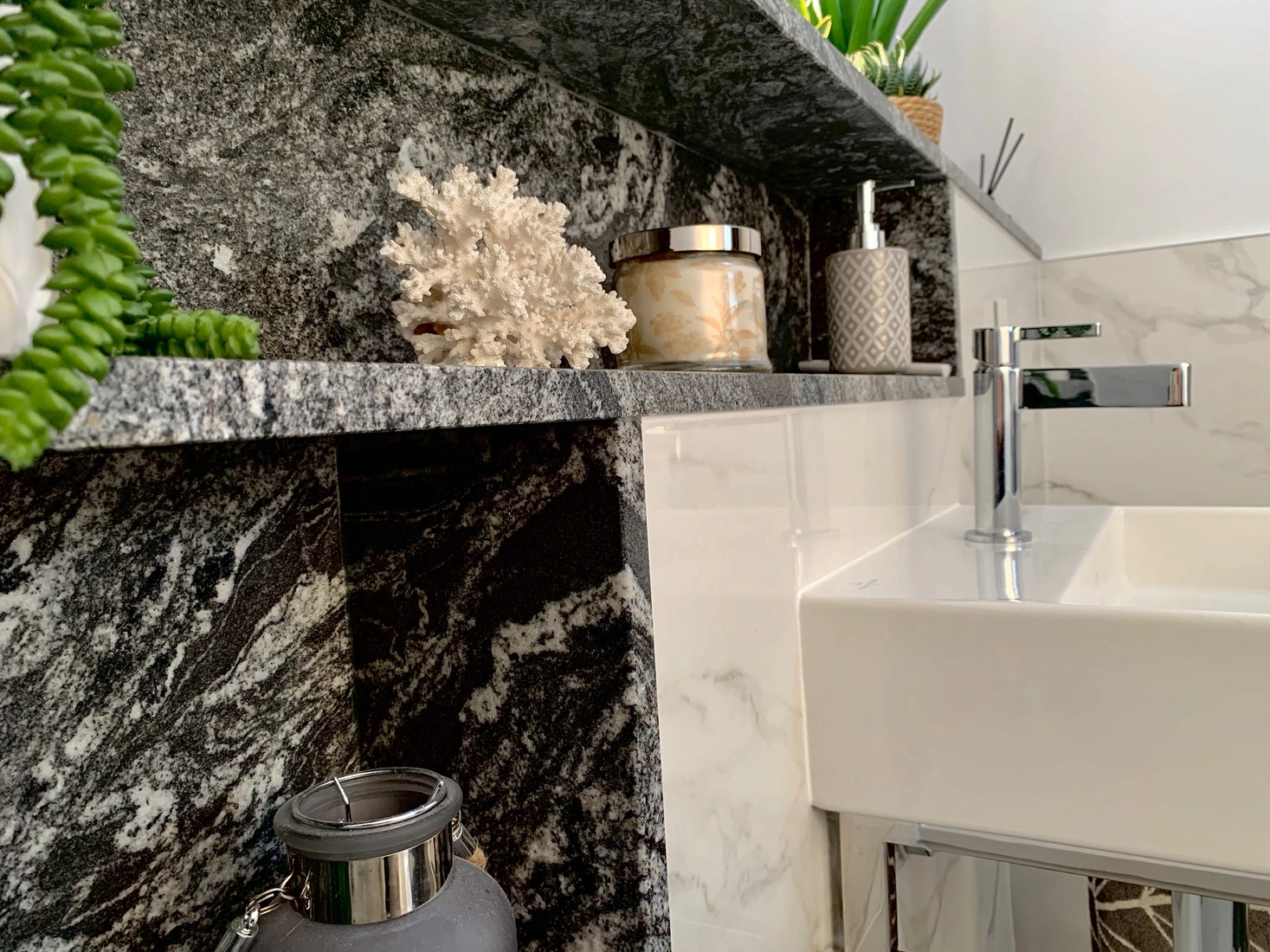 This bathroom was designed by the team at Bathroom Studio, based in Doncaster. They created a functional storage unit as an extension of the boxed plinth unit that houses the toilet cistern. Instead of simply opting for the matching tile, the customer chose Sensa Black Beauty granite from Silestone. This Indian granite with a black base is full of white streaks that resemble the foam of the waves in an indomitable ocean. It provides a beautiful contrast to the white, marbled tile, complimenting the overall design. Incorporating a stone into a design adds a natural element to the space, perfect for a bathroom, adding to the overall tranquillity we associate with this room.