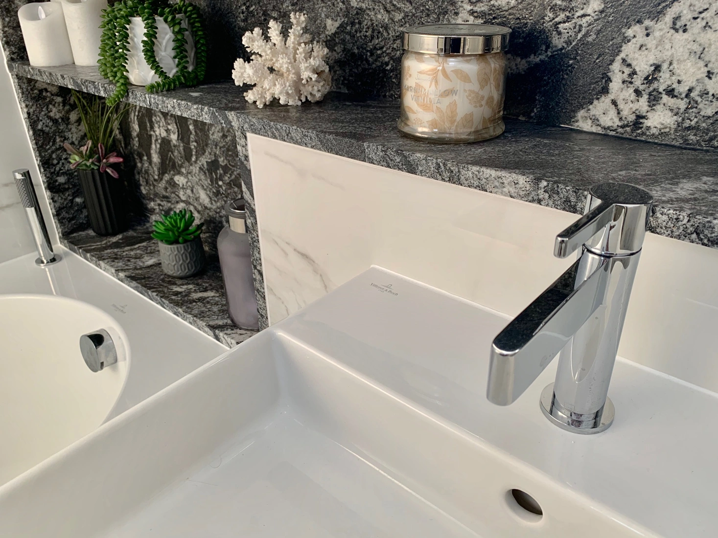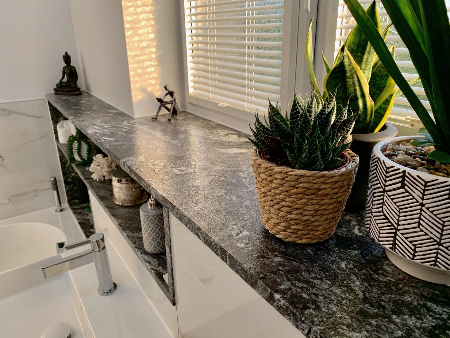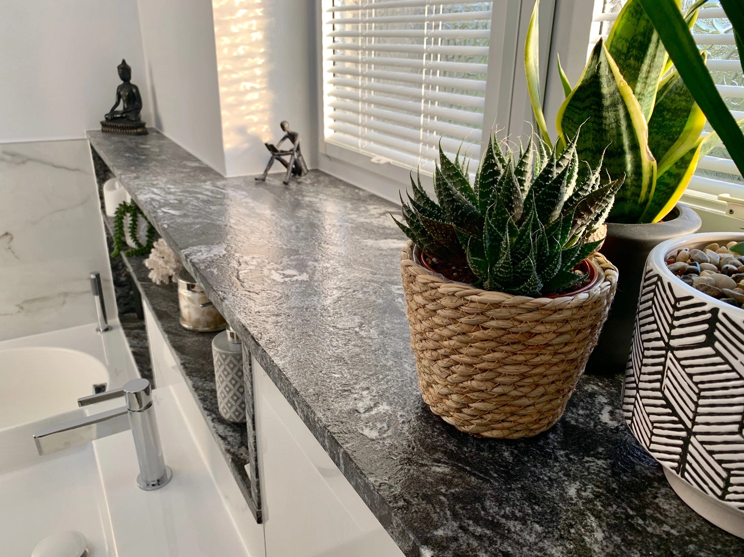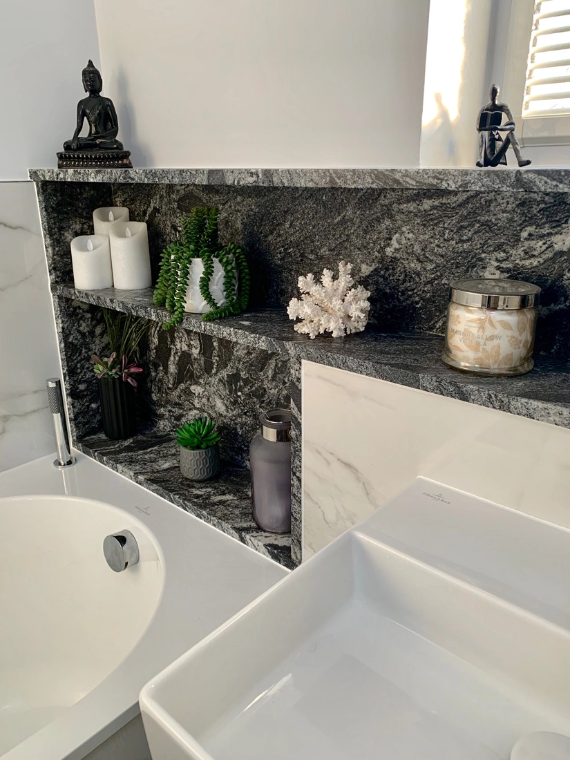 The design is both functional and stylish, creating a useful organisation system to store products and accessories, such as how the customers styled theirs. It takes away the need for additional storage units, decluttering the space. The stone has a matte, textured finish too, also contrasting the high shine tiles. This additional texture also adds another naturalistic element to the space. Overall, we love this bathroom design and the unique, bespoke use of Sensa granite.